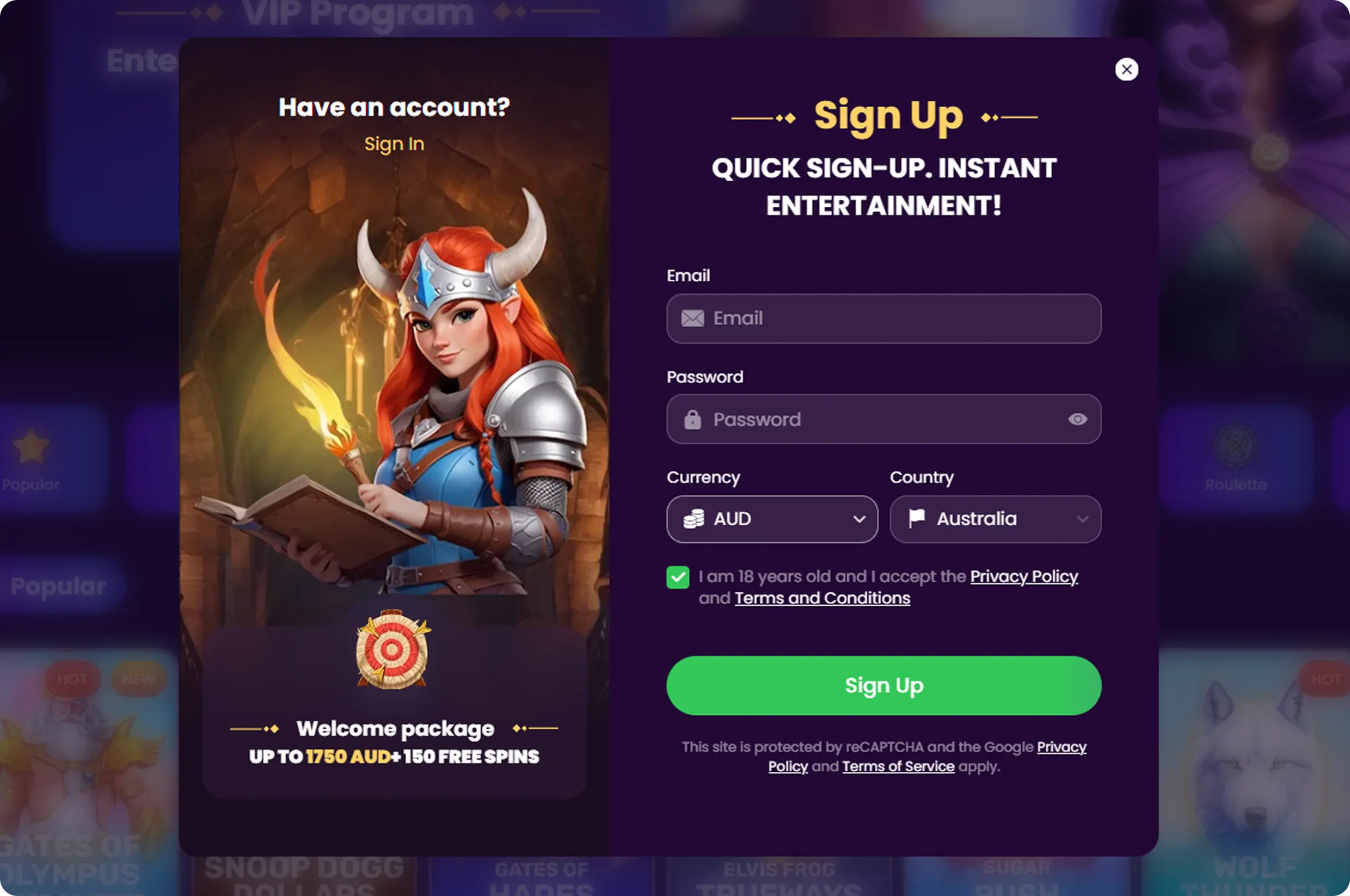 100% up to A$500 + 150 Free Spins