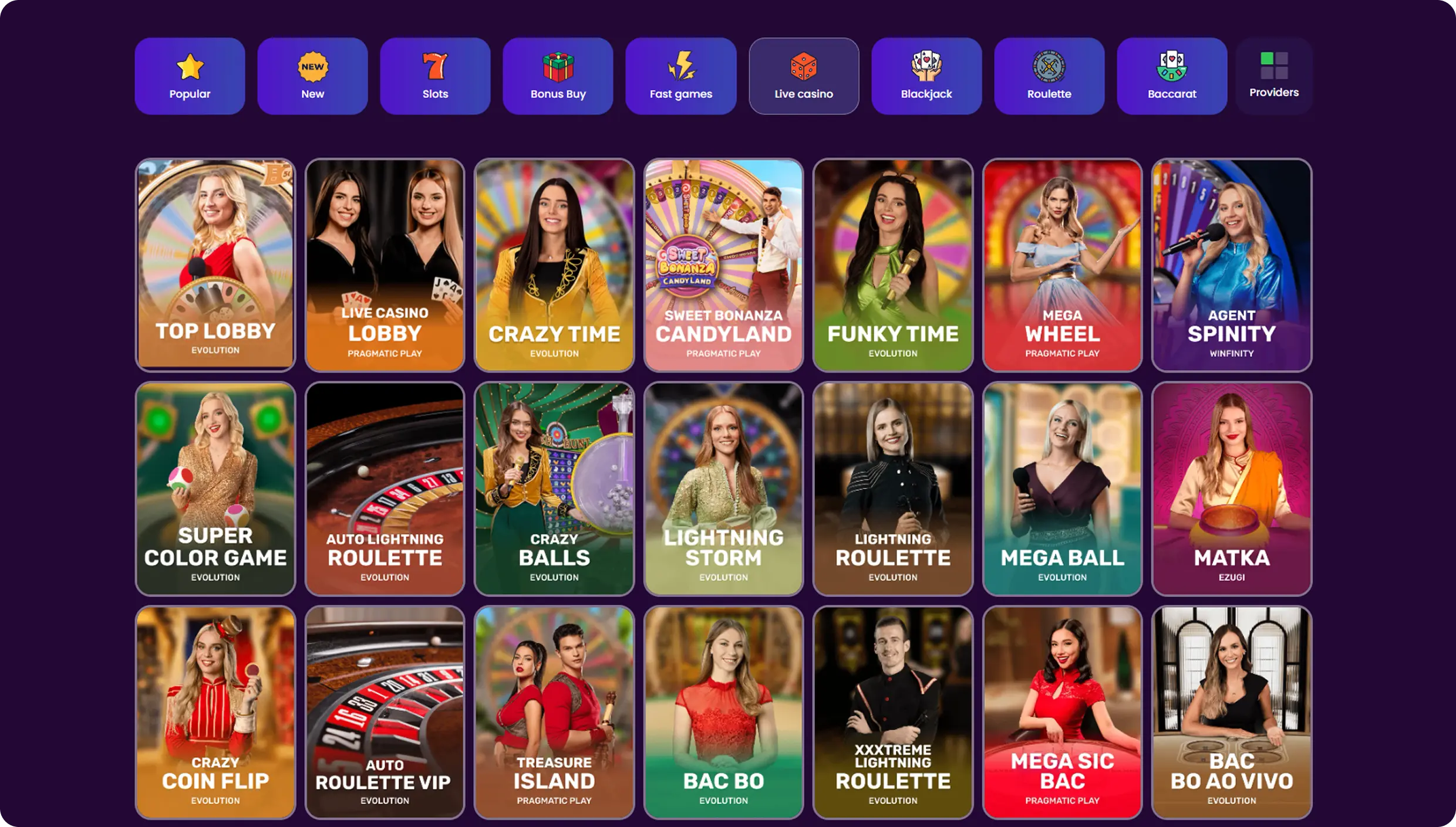- Game Shows such as Crazy Time, Sweet Bonanza Candyland, Mega Ball, Crazy Coin Flip
